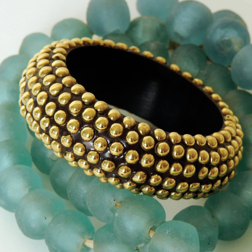 Wood & Gold Metal Bangle Bracelets - Medium Width - "Beads" Design