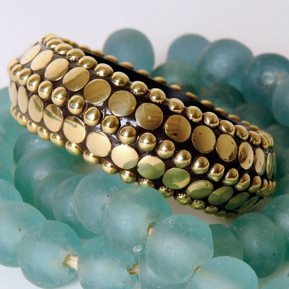 Wood & Gold Metal Bangle Bracelets - Medium Width - "Dots" Design
